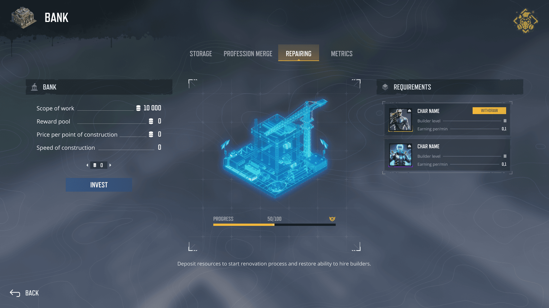 Построить UX вокруг core gameplay — управление персонажем, навигация, боевые действия, взаимодействие с миром. Второй слой — связать геймплей с экономикой и Web3 так, чтобы: — Экономические системы усиливали игровой цикл; — NFT, рынок и стейкинг были естественной частью меты; — Весь опыт — от боя до торговли — был цельным и предсказуемым.